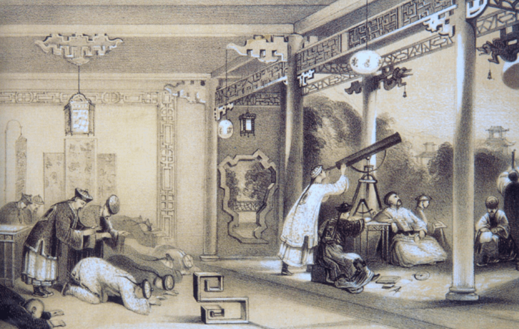 Fig. 1 – Eclipse observation in China around 1840. Astronomers calmly observe an eclipse and the servants, terrified, prostrate themselves on the ground to placate the bad omen. Credit: History of China and India © Mary Evans/ Explorer. Source: Brunier and Luminet, Glorious Eclipses, Cambridge University Press.