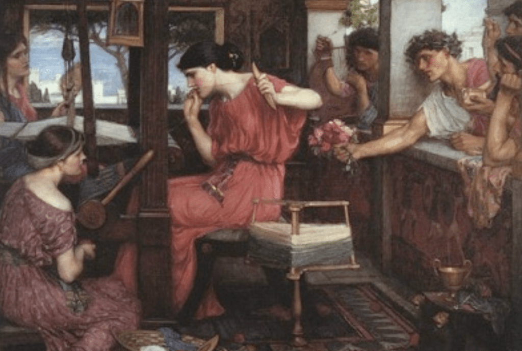 Fig. 2 – Penelope’s suitors, by John William Waterhouse (1912). While Odysseus struggled to return home after the Trojan War, his throne and his wife were being disputed. But Penelope decided to wait for his husband. Credit: Public domain.
