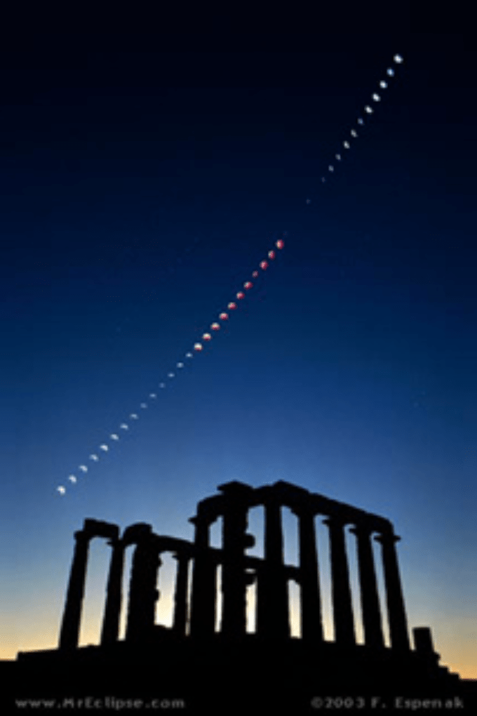 Lunar eclipse in Athens, Greece, January 9, 2001. Multiple exposure technique shows an eclipsed Moon, which during totality assumes a deep red color. Credit: © 2002, photo by Fred Espenak.