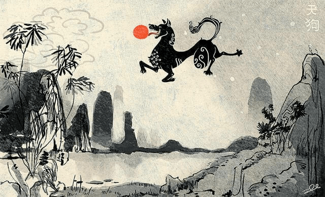 A tale tells that the Ancient Chinese believed that solar and lunar eclipses were produced by a hungry dog named Tiangou or Tian Gou (“heavenly dog”), trying to eat the sun or moon. Luckily, Tiangou was always stopped by the god of childbirth, Chang Xian, an expert archer…