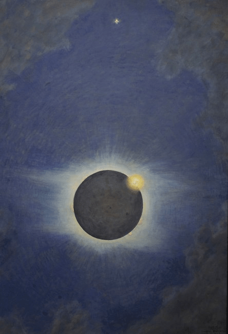 Howard Russell Butler (1856–1934; born New York City, NY; died Princeton, NJ), Solar Eclipse, Lompoc 1923, 1923. Oil on canvas, 122.5 × 82.5 cm. Princeton University, gift of H. Russell Butler Jr. Courtesy of Princeton University Art Museum. Source: https://artmuseum.princeton.edu/transient-effects/painter-sun/eclipse-paintings-howard-russell-butler/butlers-eclipse-paintings