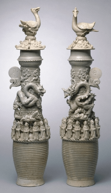 Southern Song dynasty, 1127–1279, Yuan dynasty, 1271–1368, Pair of “Sun Moon” Funerary Vases, 13th–14th centuries Porcelain with blue-green glaze and appliqué designs .1 a-b (sun): h. 79.0 cm., diam. 18.1 cm. (31 1/8 x 7 1/8 in.) .2 a-b (moon): h. 78.8 cm., diam. 18.2 cm. (31 x 7 3/16 in.) Princeton University Art Museum. Gift of Nelson Chang, Class of 1974, on the occasion of the 25th Reunion of the Class of 1974.