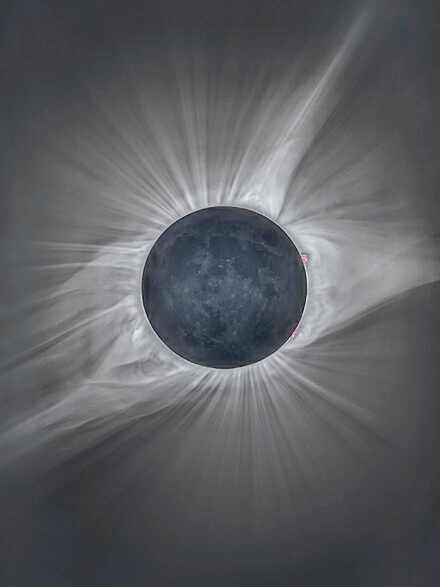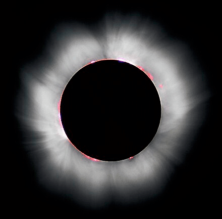 Just below, according to Wikipedia “The solar corona with its coronal streamers stretching outward, as well as solar prominences (in red) along the limb of the earthshine illuminated Moon during a total solar eclipse.”